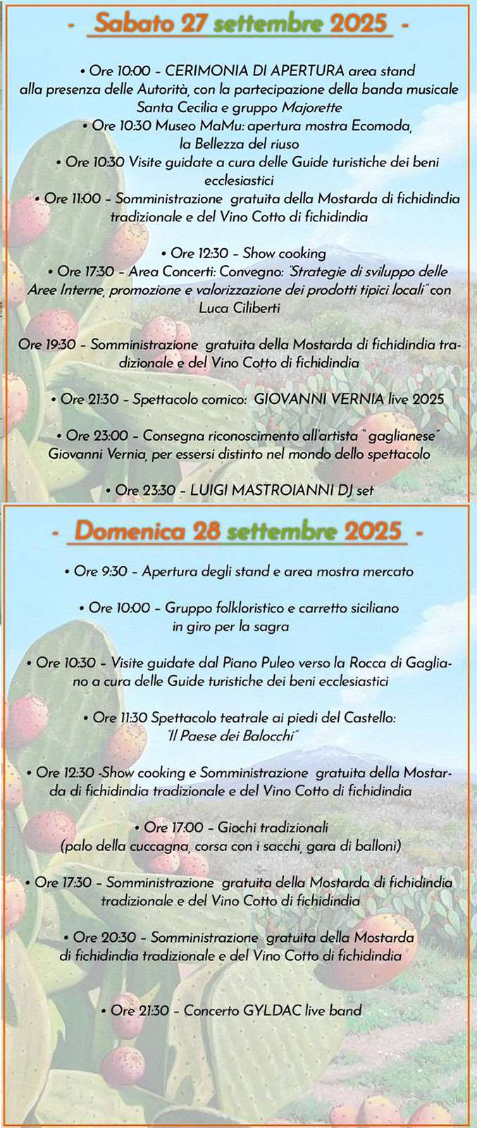 La Sagra della Mostarda di Ficodindia a Gagliano è in programma il 27 e 28 settembre e come di consueto celebra il frutto pregiato del territorio con una serie di iniziative. La sagra, organizzata dalla Proloco di Gagliano Castelferrato, è una kermesse gastronomica con protagonista indiscusso il ficodindia che coinvolgerà la zona dell’antico bevaio di Sant’Antonino. Negli stand allestiti per l’occasione si potranno degustare i fichidindia Bastardoni di Sicilia, la mostarda preparata all’interno del tipico “quadaruni” e tante altre prelibatezze a base del frutto nativo del Messico, mentre i numerosi ospiti che tutti gli anni affollano la cittadina ennese saranno intrattenuti con tantissimi spettacoli a cui farà da cornice il centro storico.