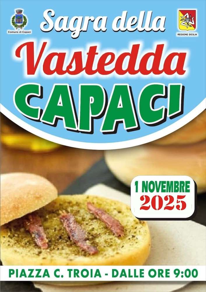 La Sagra della vastedda di Capaci, in programma il 1° novembre, è tra quelle più attese e richiama numerosi visitatori da ogni parte della provincia che giungono in paese per degustare la focaccia, che viene ancora preparata secondo la tradizione. La vastedda costituisce un piatto semplice e facile da preparare, che sin dai tempi lontani veniva acquistata dalla gente di buon mattino già condita, prima di recarsi al lavoro e prevedendo di fare ritorno a casa nel pomeriggio inoltrato. Questa usanza era messa in pratica dai contadini che si recavano a lavorare nei campi e aveva luogo in occasione della giornata dedicata al culto dei morti e alle visite ai cimiteri. Infatti, questi ultimi erano lontano dai centri abitati e venivano raggiunti a piedi, al termine di una lunga giornata di duro lavoro.
