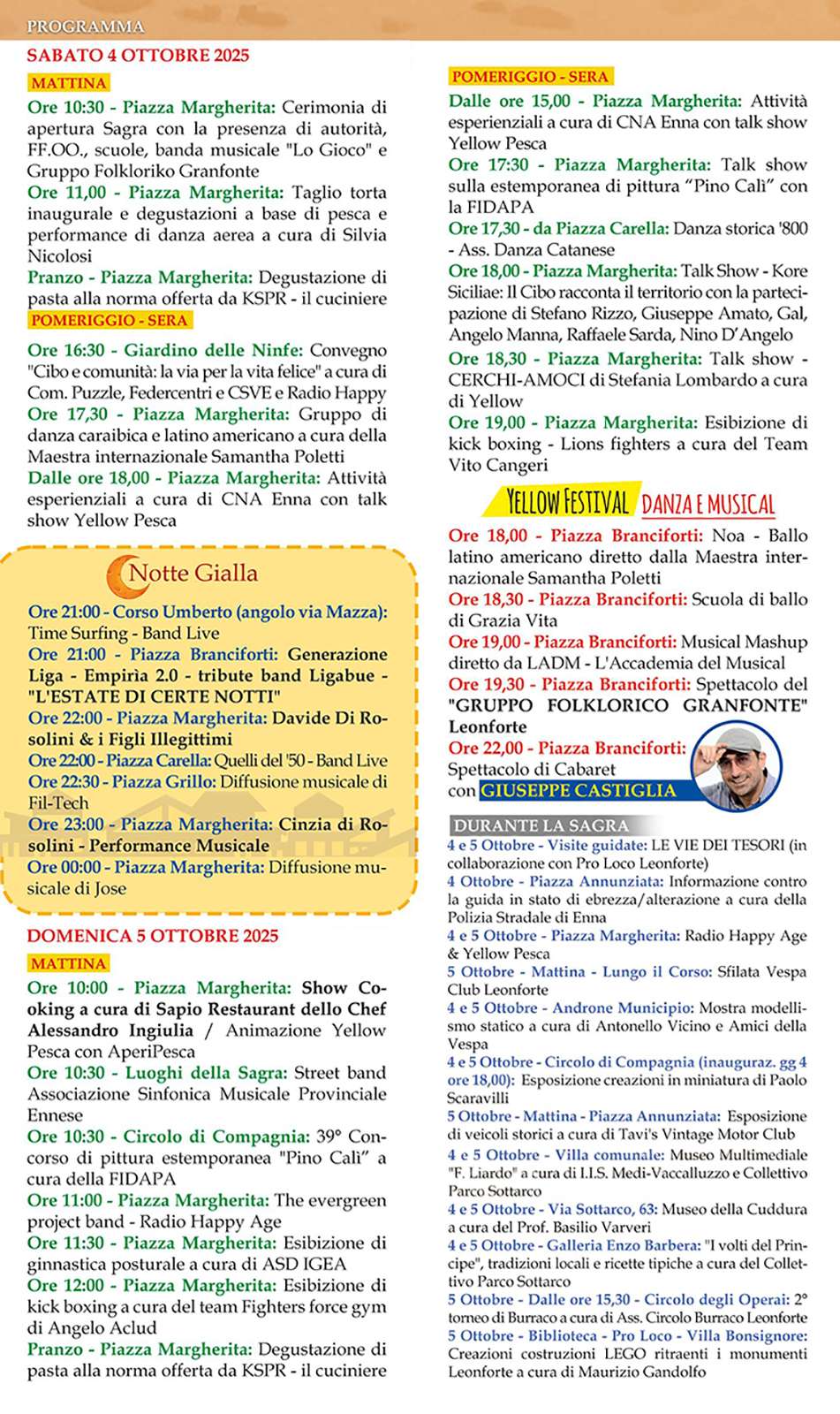 La Sagra della Pesca di Leonforte promette di essere un’esplosione di sapori, divertimento e cultura locale. Le suggestive Piazza Branciforti e Piazza Margherita si trasformeranno in un festival di esperienze uniche: musica dal vivo, degustazioni imperdibili e tantissime attività interattive per i più piccoli. Oltre a vivere il cuore della Sagra di Leonforte, i visitatori si immergeranno in un mondo di arte, musica e spettacolo che renderanno il weekend di ottobre davvero indimenticabile. Yellow Pesca sarà un vero e proprio viaggio tra emozioni, arte e cultura, capace di coinvolgere grandi e piccoli in un’esperienza unica!