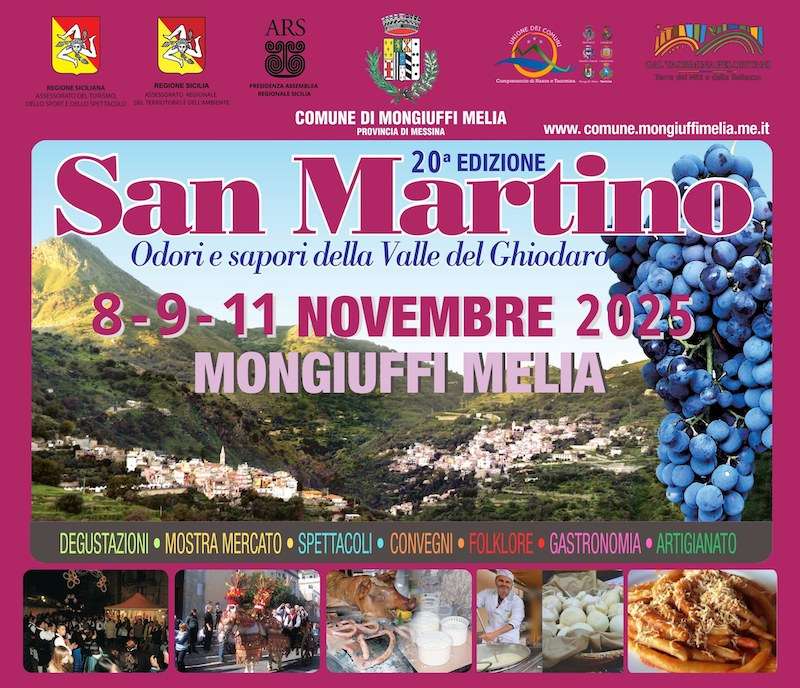 Il comune di Mongiuffi Melia si articola nei due centri abitati di Mongiuffi e Melia, che si affacciano l’uno sull’altro, collegati da un ponte sul fiume Ghiodaro, il quale dà il nome all’intera valle, caratterizzata da pittoreschi borghi. Durante la Sagra di San Martino, prevista per i giorni 8, 9 e 11 novembre, sarà possibile immergersi nelle tradizioni locali attraverso una varietà di degustazioni: formaggi, salsiccia, porchetta al ceppo, castagne, miele, salumi e vino, il tutto all’interno di una mostra mercato con numerosi stand di artigianato e prodotti tipici siciliani.