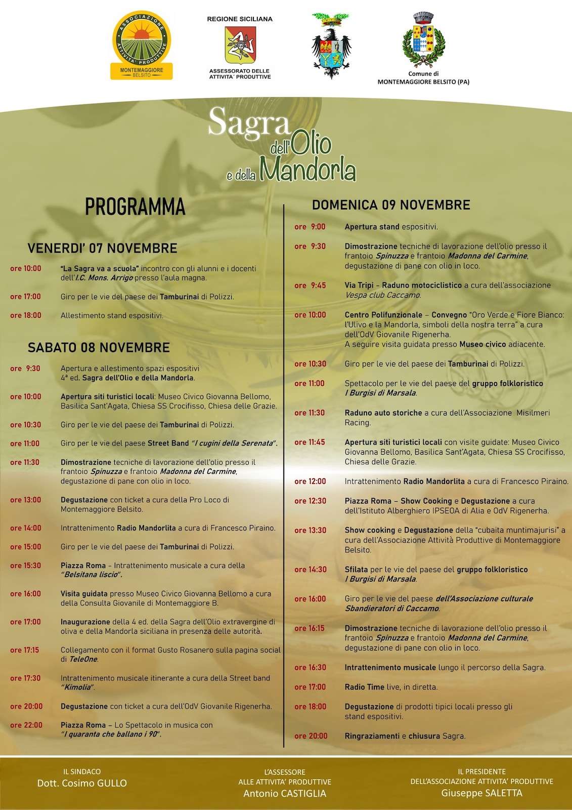 La Sagra dell’Olio e della mandorla di Montemaggiore nasce con l’obiettivo di promuovere e valorizzare le ricchezze agroalimentari locali, quali l’ottimo olio d’oliva che si produce nelle campagne attorno al paese e la pregiata mandorla locale. L’olio che si produce nel territorio montemaggiorese si ricava dalle olive dei suoi alberi secolari, la cui raccolta avviene tra settembre e dicembre, e si caratterizza per le sue sfumature giallo ambra, il sapore, la fragranza e naturalmente per le sue proprietà organolettiche, essendo ricco di antiossidanti e di polifenoli. La mandorla coltivata sulle colline di Montemaggiore che si affacciano sulla valle del fiume Torto, è della varietà Pizzuta, deve il suo nome alla tipica forma del becco di un corvo, dolce e dal profumo intenso è molto apprezzata per il suo aroma unico e inconfondibile. La mandorla a Montemaggiore viene raccolta e lavorata dai giovani imprenditori locali per essere trasformata in creme dolci spalmabili ed anche in deliziosi croccantini, in gustose tipicità siciliane e tanto altro.