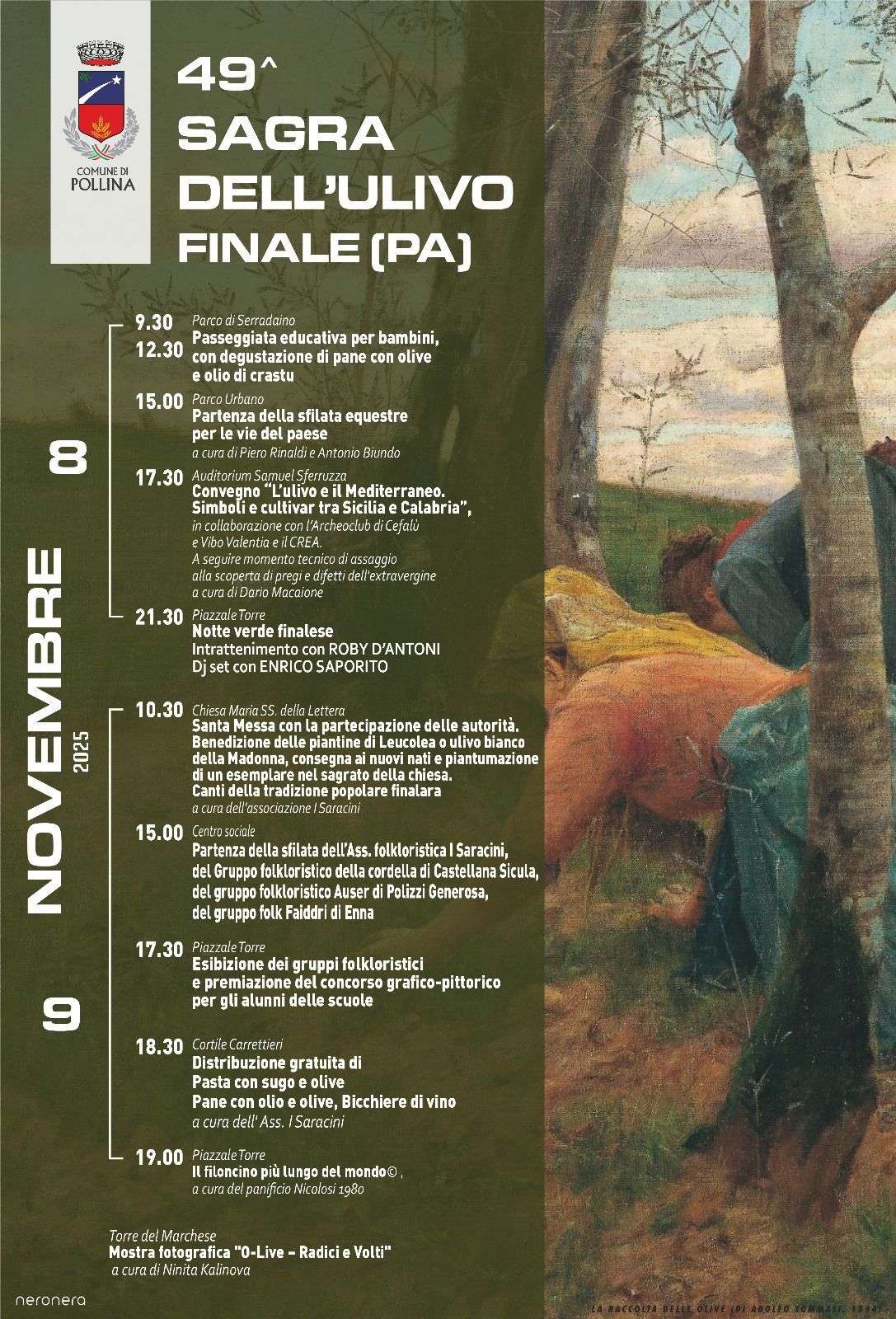 Durante la Sagra dell’ulivo di Finale di Pollina, promossa dal Comune di Pollina con il patrocinio dell’Assessorato all’Agricoltura della Regione Siciliana, per le vie del centro abitato sfileranno i gruppi folkloristici con gli abiti caratteristici e negli stand si potranno degustare i prodotti tipici della tradizione. I bambini avranno l’opportunità di esplorare il suggestivo bosco di Serradaino, partecipando a un incontro speciale dedicato agli ulivi, che culminerà con una gustosa merenda a base di pane, olio e olive. Non mancheranno la musica e i canti della tradizione popolare, la mostra fotografica, i carretti siciliani, la consegna tradizionale delle piante d’ulivo ai nuovi nati, la sfilata equestre per le vie del paese, gli stand dove gustare la pasta alla finalara con sugo e olive e naturalmente il pane condito con l’olio, le olive e il vino locale.