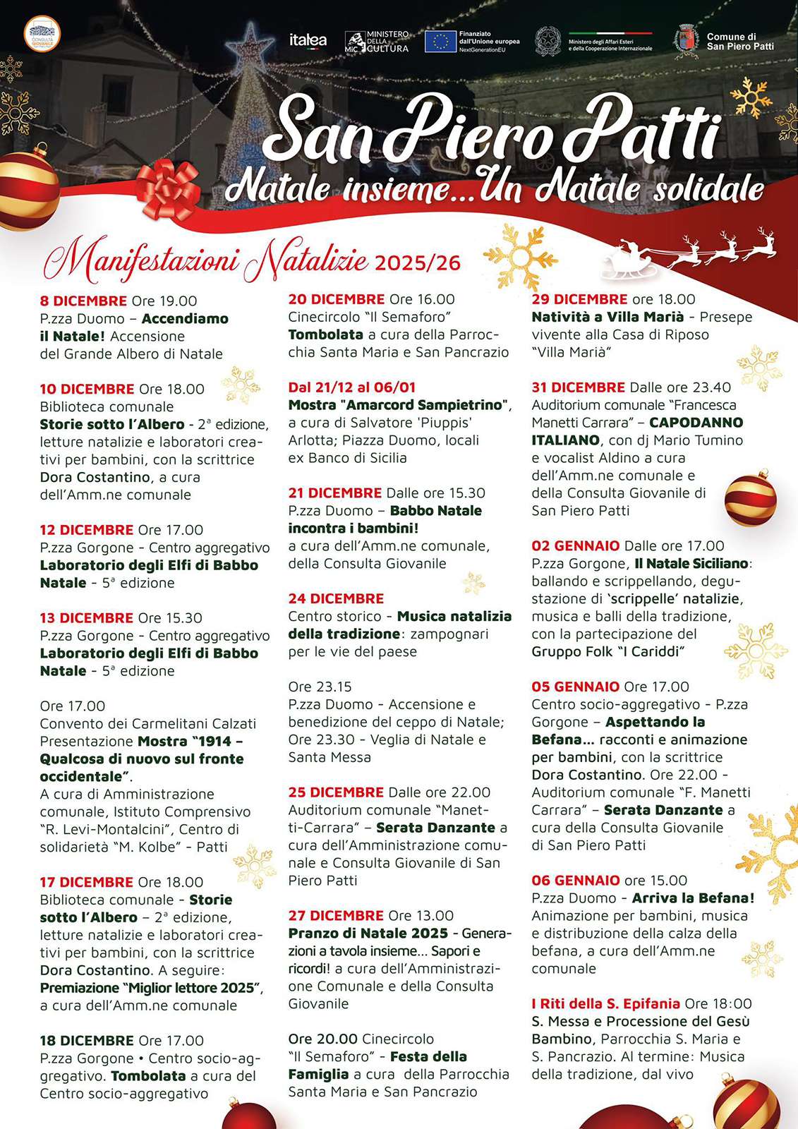 Il Natale a San Piero Patti trascorre tra musica, teatro, degustazioni, la sfilata del corteo storico Federico IV d’Aragona, l’arrivo di Babbo Natale in piazza, il Presepe Vivente, il concerto di Natale, la mostra mercato artigianale e la tradizionale Festa della Nocciola.