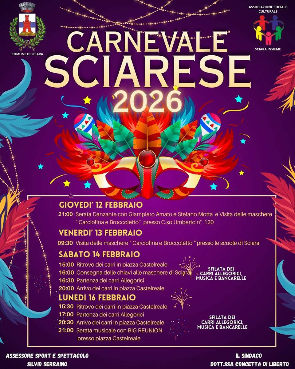 Le giornate di Carnevale a Sciara sono animate da feste con musica e balli, dalla sfilata dei gruppi in maschera assieme ai carri di Carnevale a cui prendono parte anche le maschere di Carciofina e Broccolino, le mascotte del Carnevale sciarese.