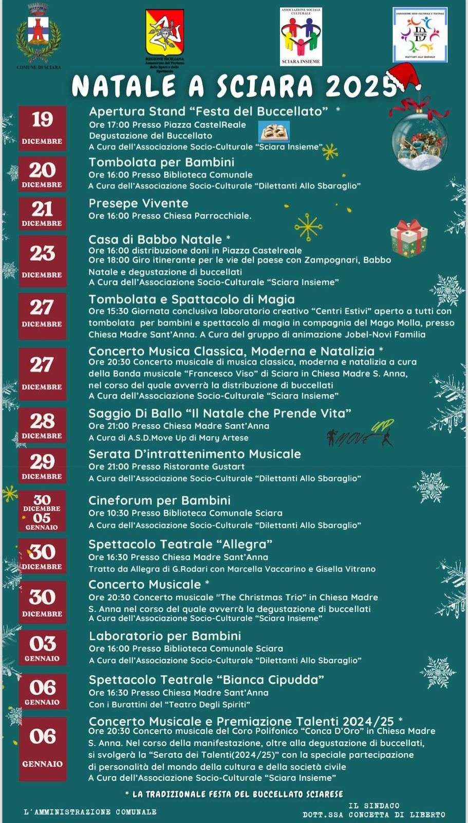 Nel giorno dell’Epifania a Sciara, dopo la celebrazione eucaristica, si svolge la processione del bambinello e va in scena la rappresentazione vivente della natività di Gesù.