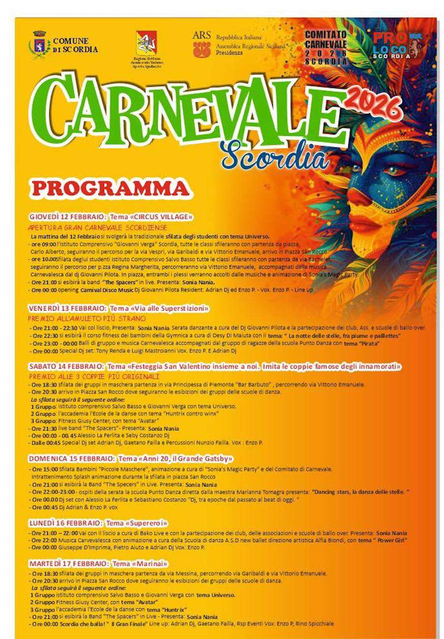 A Carnevale, Scordia si riempie di colori e allegria con le vivaci sfilate dei gruppi in maschera, protagonisti gli allievi delle scuole di danza locali.
