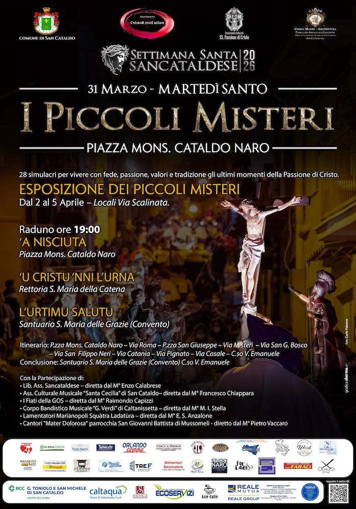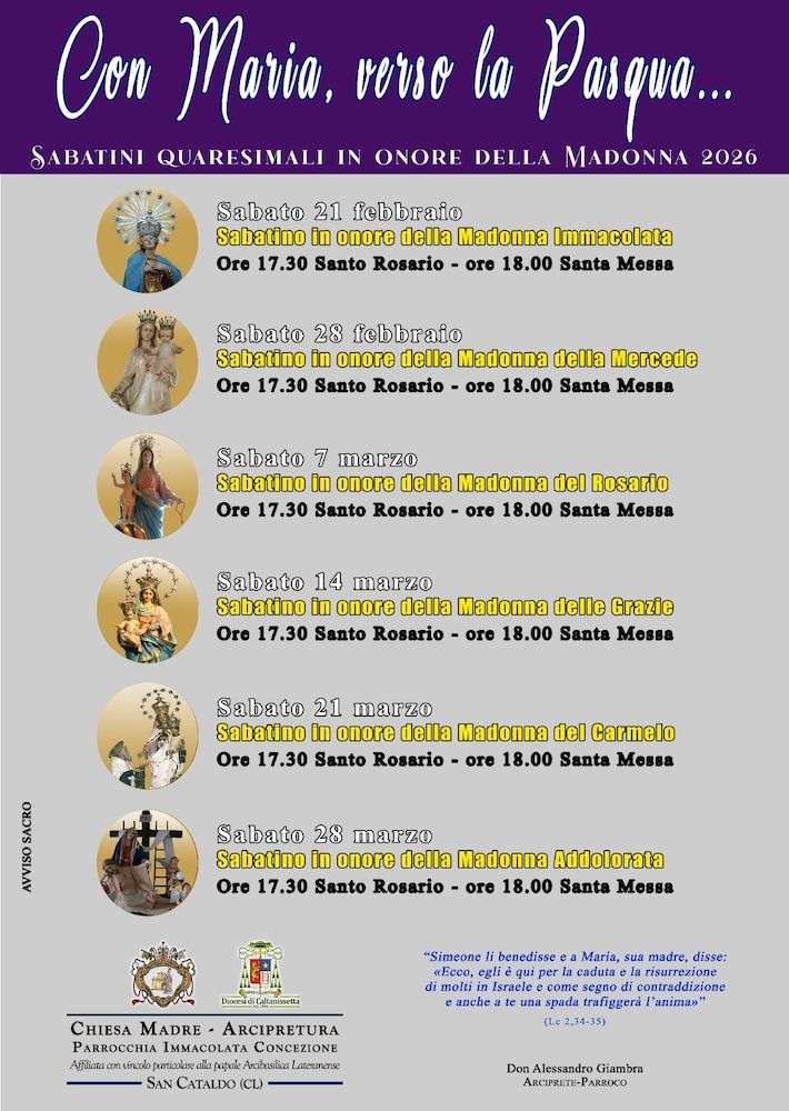 La Pasqua è una festività religiosa molto sentita in tutta la Sicilia. Ma quella che si vive a San Cataldo, in provincia di Caltanissetta, è particolare. I riti della Settimana Santa di San Cataldo sono preceduti da mesi e mesi di preparazione, attraverso i Sabatini in onore della Madonna, un tempo organizzati dai vari ceti sociali. Ogni venerdì di Quaresima, i sancataldesi, a turno, conducono alla chiesa Madre la statua della Madonna Immacolata, conservata per un anno intero da una famiglia della categoria di appartenenza. Il sabato pomeriggio, tra spari di mortaretti e bande musicali, il simulacro viene accompagnato fino alla casa della famiglia devota, che la custodirà per un altro anno.