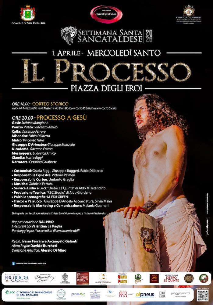 La sera del Mercoledì Santo, in Piazza degli Eroi si svolge la drammatizzazione del Processo a Gesù preceduta dalla sfilata di un corteo di centinaia di personaggi con addosso costumi degli antichi romani, raffiguranti legionari, sacerdoti, principi e popolo ebreo. Terminato il processo, Gesù viene condotto al calvario e lungo il tragitto cade due volte sotto il peso della croce.