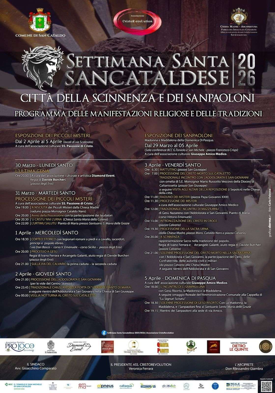 Le celebrazioni della Settimana Santa di San Cataldo ufficialmente cominciano la Domenica delle Palme con la rievocazione dell’ingresso di Gesù a Gerusalemme, e comprendono diversi appuntamenti, a metà tra la rappresentazione teatrale e il rito religioso, che vedono la partecipazione di figuranti e gruppi statuari.