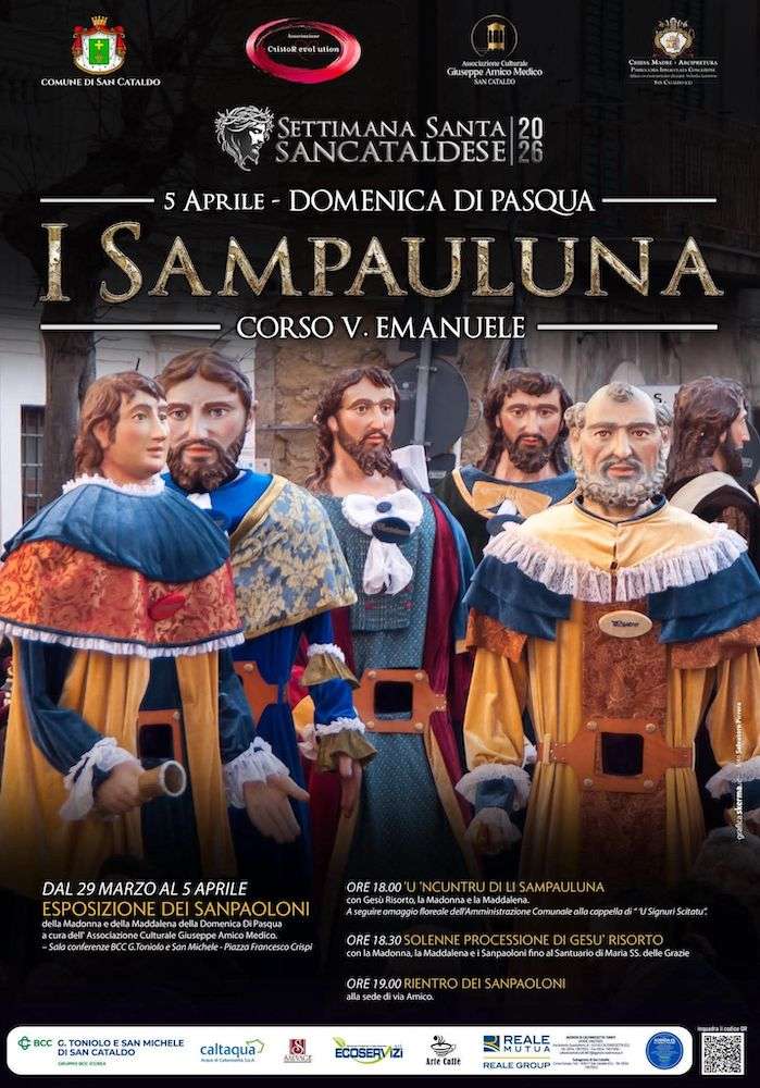 La Settimana Santa di San Cataldo si conclude la Domenica di Pasqua, con la sfilata dei “Sampauluna”, statue gigantesche di cartapesta, originarie della Spagna e risalenti all’Ottocento, raffiguranti gli Apostoli che, lungo il corso principale del paese, incontrano il Cristo Risorto.