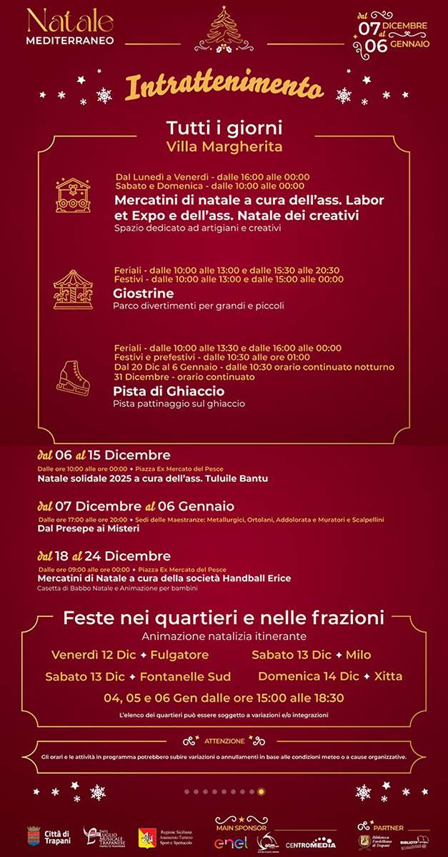 L’accensione delle luminarie e dell’albero di Natale inaugura il Natale a Trapani con un cartellone ricco di eventi tra cui canti tradizionali natalizi, concerti musicali nelle chiese, presepi artigianali in mostra, mercatini e sfilate delle bande musicali e degli zampognari per le vie del centro storico.